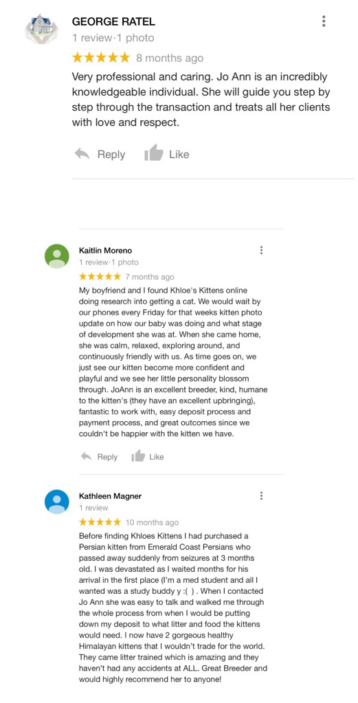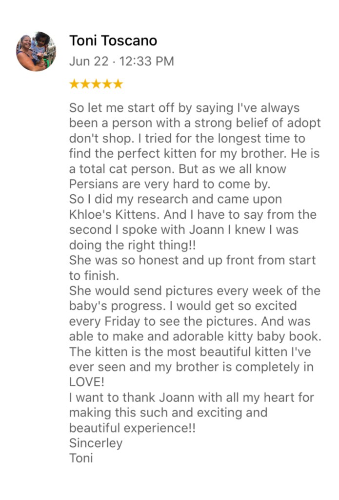 If you are ready to reserve your new family member you can email, or text me however I can not agree to the sale of any kitten unless I speak to the individual who the kitten will be residing with. (same person will drop off their $300 kitten deposit when the kitten is 3-4 weeks of age, sign the purchase agreement, and pickup up their kitten at approx 8 weeks of age and sign their kitten contract). We also can do live facetime meetings for those who cannot come in person due to distance, scheduling etc, Exceptions can be made for mail in/zelle deposits. Serious inquiries only please. My telephone number is (201)398-6766 & my email is khloeskittens@yahoo.com We are available for calls or texts between 8am-9pm. More information below…