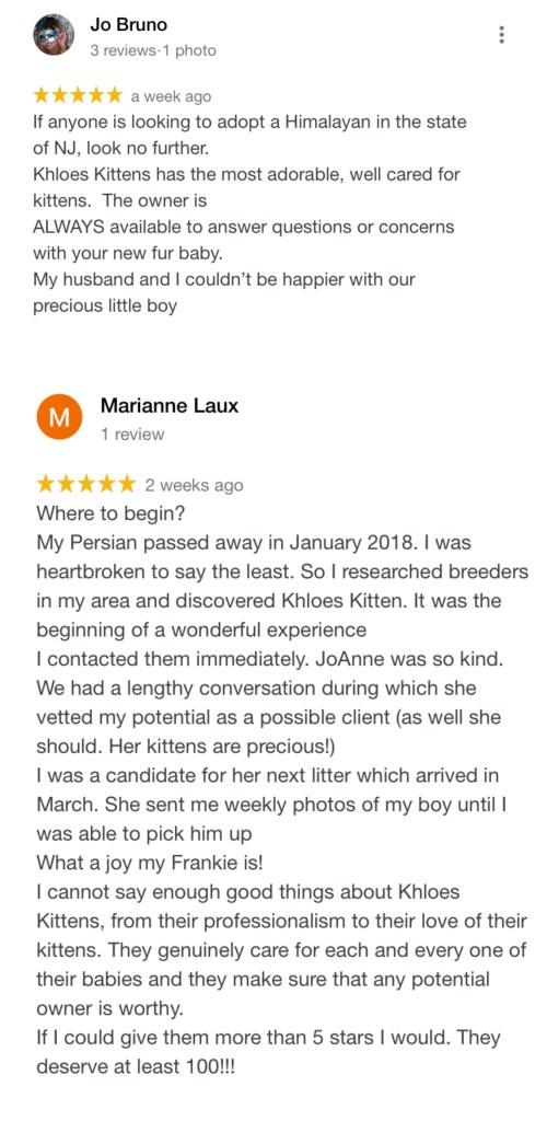 My name is Jo Ann and I have been breeding Persian, Himalayan (also known as the ColorPoint Persian) and Exotic kittens for many many years. This is not a hobby or just a business to me. It is my passion. Breeding cats is something I have known I wanted to do all of my life. I am devoted to placing our kittens in responsible and loving homes as the kitten’s health and well-being are my number one priority above anything else. We are a cageless in home cattery. We are not an adoption agency or pet store. We are a reputable breeder that has kittens for sale. Khloe’s Kittens is dedicated and focused on the health and well-being of our cats and kittens, and the promotion of the Persian, Himalayan, and Exotic shorthair breed. Our kittens are bred and raised in a loving home environment with very personal attention throughout, and we are devoted to placing them in forever homes where we will have confidence they will be loved, cared for and can thrive. The kittens are raised around my children and a large German shepherd, so they are very well socialized and have amazingly friendly temperaments by the time they go to their forever homes. At Khloe’s Kittens, we have kittens for sale yet so much more. These kittens are our babies and are a part of our family until they go home to you. We are dedicated to nurturing healthy, happy, beautiful kittens, and preparing them to become a treasured member of your family. There is so much hard work and dedication that goes into owning a cattery. I’ve poured my heart and soul into this business. The early mornings, the late and sleepless nights when moms are giving birth, the extensive kitten care and cleaning of the cattery etc. The joys of seeing our countless customer’s faces at deposit time and at pickup is what I love most and brings me the most joy. These kittens have healed so many hearts…from the widower to our soldier heroes, to our customers who have lost children or other pets and loves ones, to divorcées, those battling illnesses, the lonely etc. I hope you will give Khloe’s Kittens the opportunity to bring much happiness and love into your life as well. Please keep scrolling for more information. All kittens pictured on our website are of our past kittens. We do not touchup or photoshop any pictures of our kittens. ***Recently it has been brought to my attention that other breeders are telling customers that they are affiliated with KHLOE’S KITTENS and have copied the content on my website to theirs just to make a sale. We are NOT affiliated with any other breeder. All kitten sales are done directly through Khloe’s Kittens only (by calling my telephone number of (201)398-6766 or by my email khloeskittens@yahoo.com One thing that can NOT be reproduced is the expertise, experience and good reputation of our long-standing cattery*** Please keep scrolling below for more information. All kittens pictured on our website are of our past kittens. We do not touchup or photoshop any pictures of our kittens………